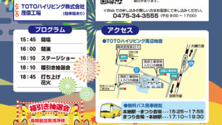 千葉県茂原市 TOTOハイリビングまつり打ち上げ花火(千葉県茂原市) TOTOハイリビングまつり打ち上げ花火は、千葉県茂原市のTOTOハイリビング茂原工場で2025年10月4日(土)に行われる花火打ち上げ。TOTOハイリビングまつり打ち上げ花火の開催日時、観覧場所、花火打ち上げ数、座席案内、プログラム、交通ア... 千葉県茂原市
