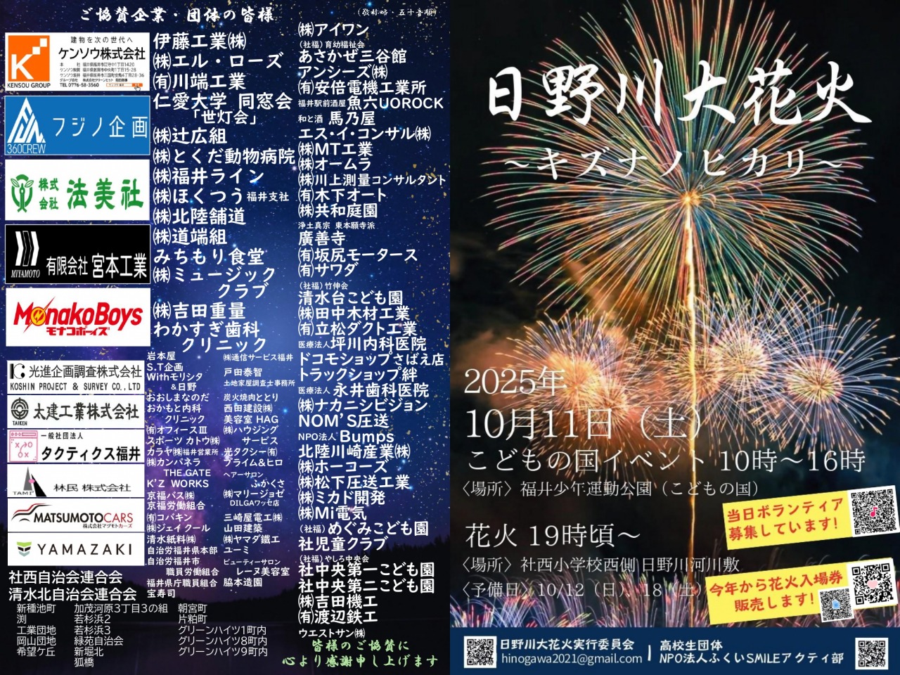 日野川大花火は、福井県福井市の社西小学校西側日野川河川敷で2025年10月11日(土)に行われる花火大会。日野川大花火の開催日時、観覧場所、花火打ち上げ数、座席案内、プログラム、交通アクセス、関連動画、写真などの詳細情報。