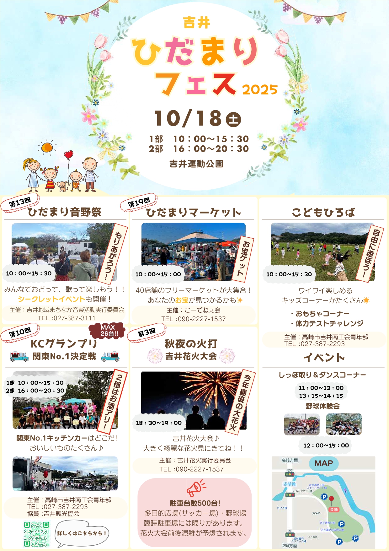 ひだまりフェスは、ひだまり音野祭、ひだまりマーケット、ひだまりKC(キッチンカー)グランプリの3つの催しが集まったイベントです、夜には吉井花火大会を開催します。