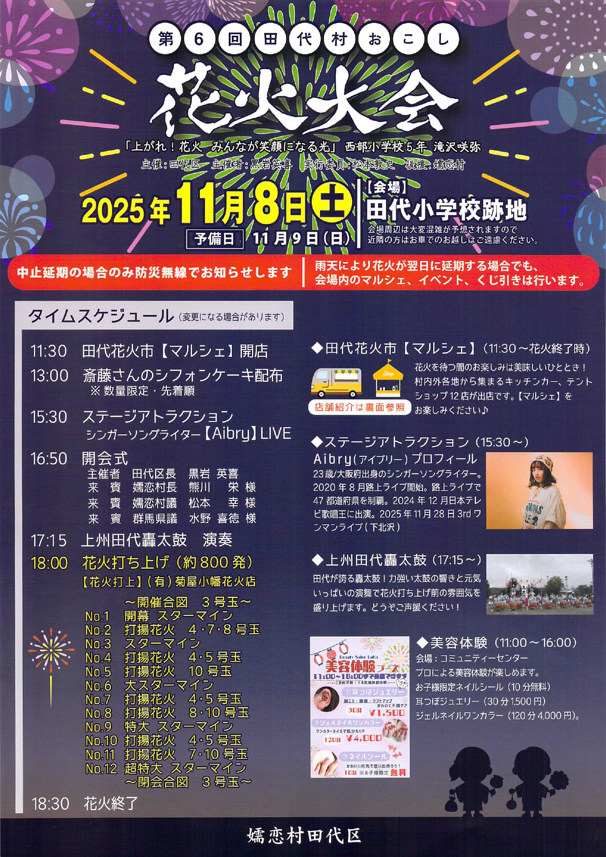 田代村おこし花火大会は、群馬県嬬恋村の田代小学校跡地で2025年11月8日(土)に行われる花火大会。田代村おこし花火大会の開催日時、観覧場所、花火打ち上げ数、座席案内、プログラム、交通アクセス、関連動画、写真などの詳細情報。