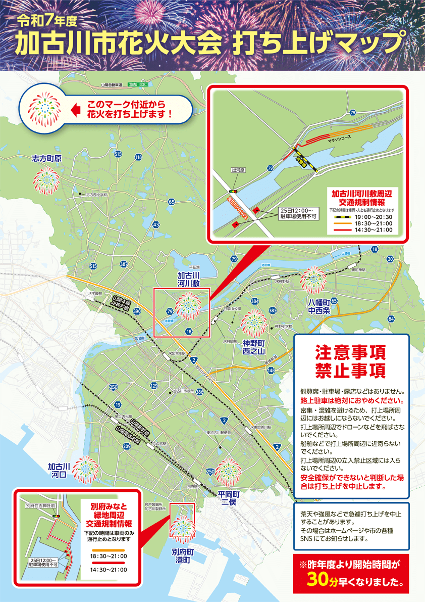 会場・観覧場所 | 加古川市内7箇所(分散打ち上げ) |