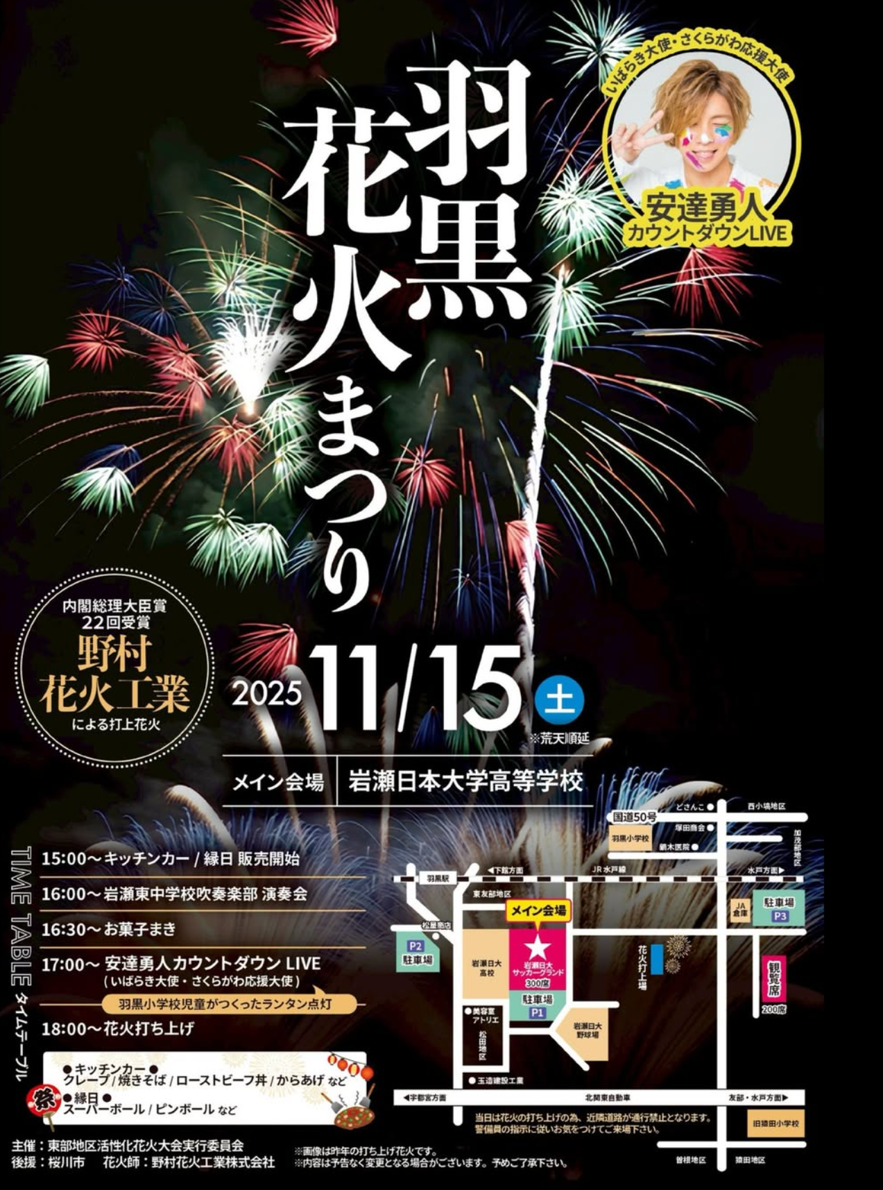 羽黒の花火まつりは、茨城県桜川市の岩瀬日本大学高等学校サッカーグラウンドで2025年11月15日(土)に行われる花火大会。羽黒の花火まつりの開催日時、観覧場所、花火打ち上げ数、座席案内、プログラム、交通アクセス、関連動画、写真などの詳細情報。