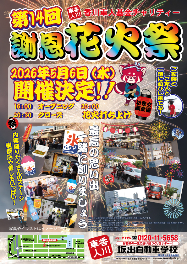 香川車人基金チャリティー謝恩花火祭は、香川県坂出市の坂出自動車学校で2026年5月6日(水)に行われる花火打ち上げ。香川車人基金チャリティー謝恩花火祭の開催日時、観覧場所、花火打ち上げ数、座席案内、プログラム、交通アクセス、関連動画、写真などの詳細情報。