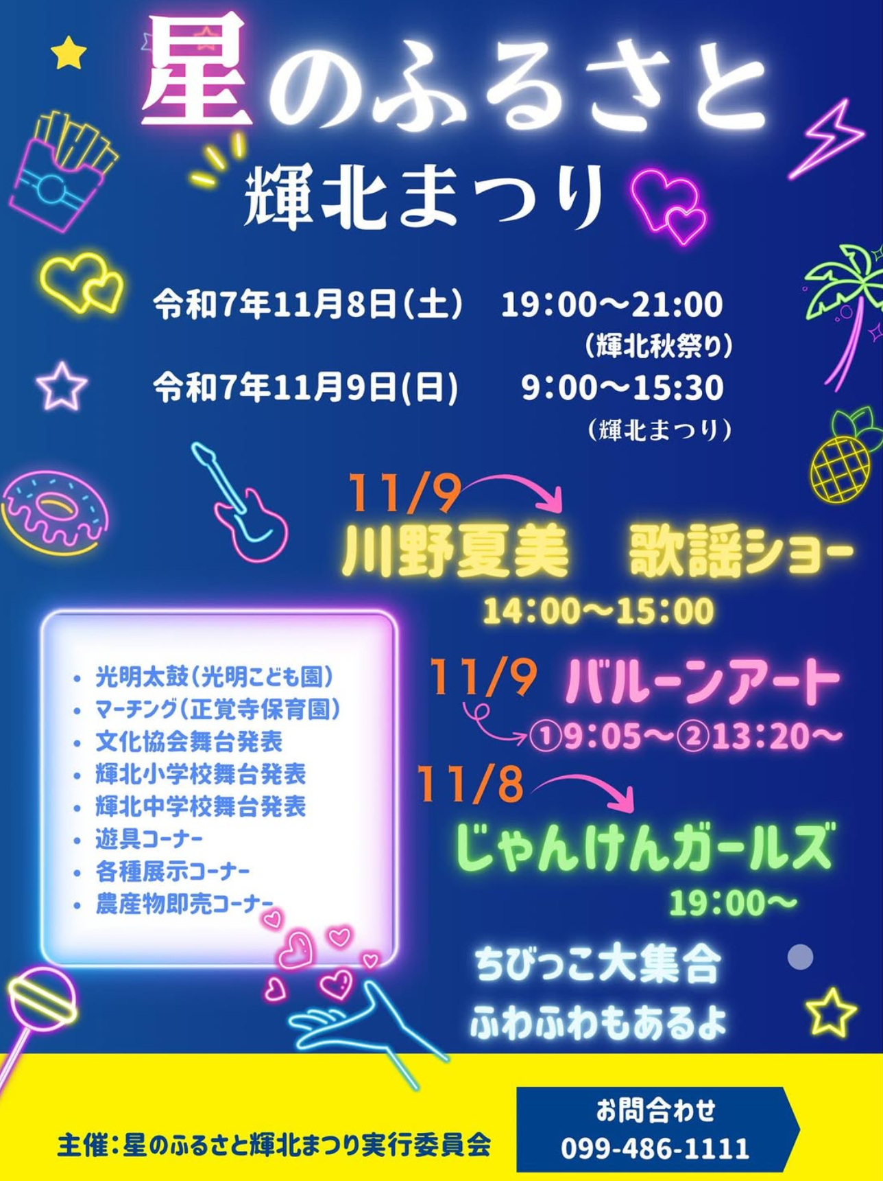 星のふるさと輝北まつりは、2025年11月8日(土)に前夜祭「輝北秋祭り」、11月9日(日)に本祭「輝北まつり」を開催。