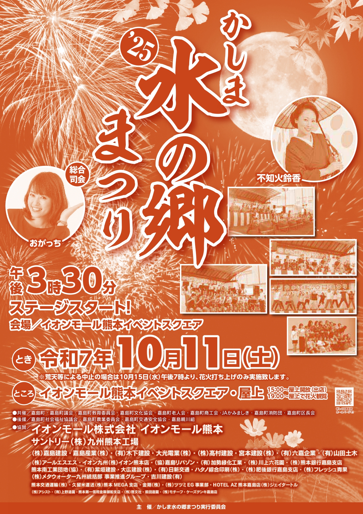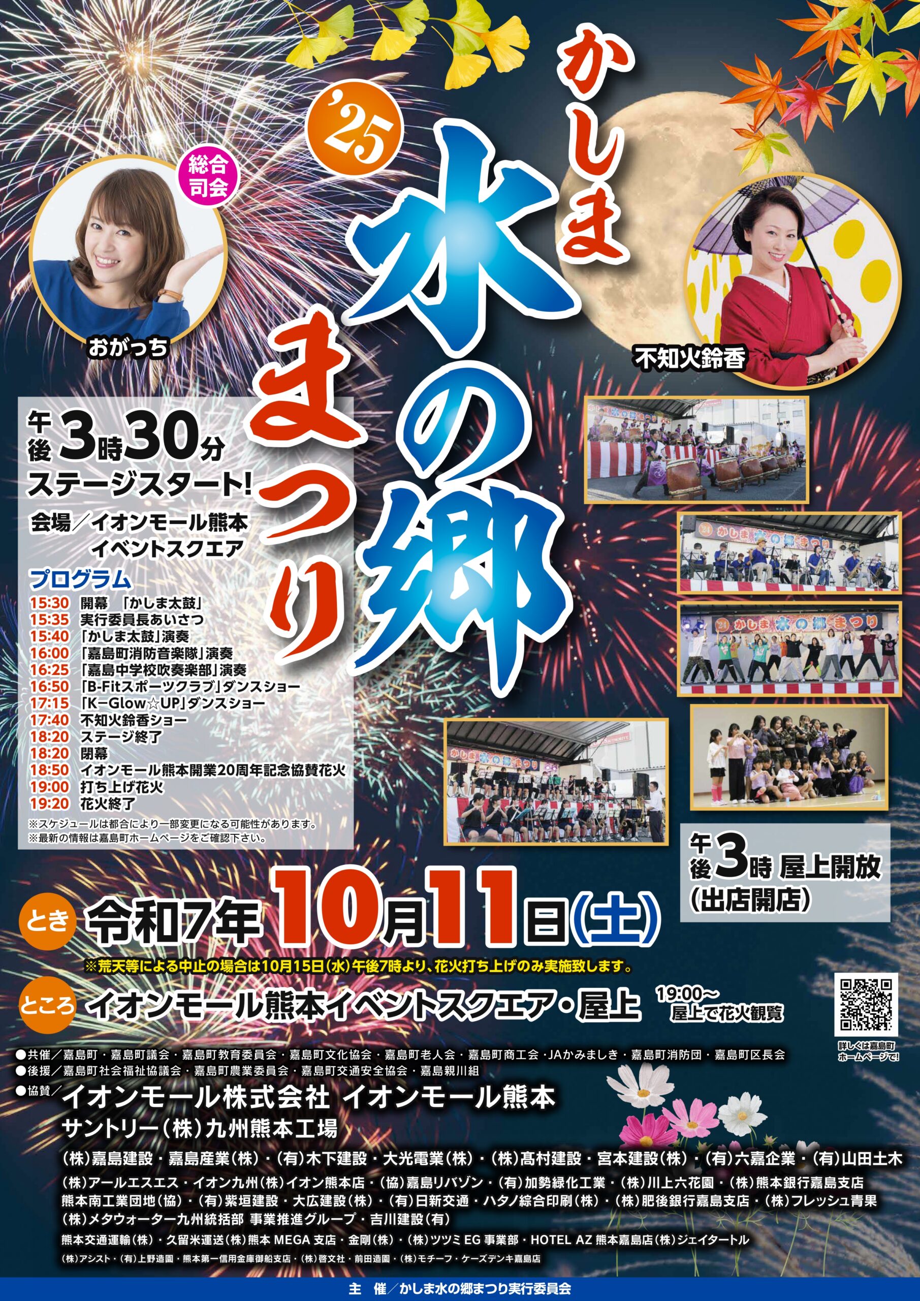 かしま水の郷まつり打ち上げ花火は、熊本県嘉島町のイオンモール熊本で2025年10月11日(土)に行われる花火打ち上げ。かしま水の郷まつり打ち上げ花火の開催日時、観覧場所、花火打ち上げ数、座席案内、プログラム、交通アクセス、関連動画、写真などの詳細情報。