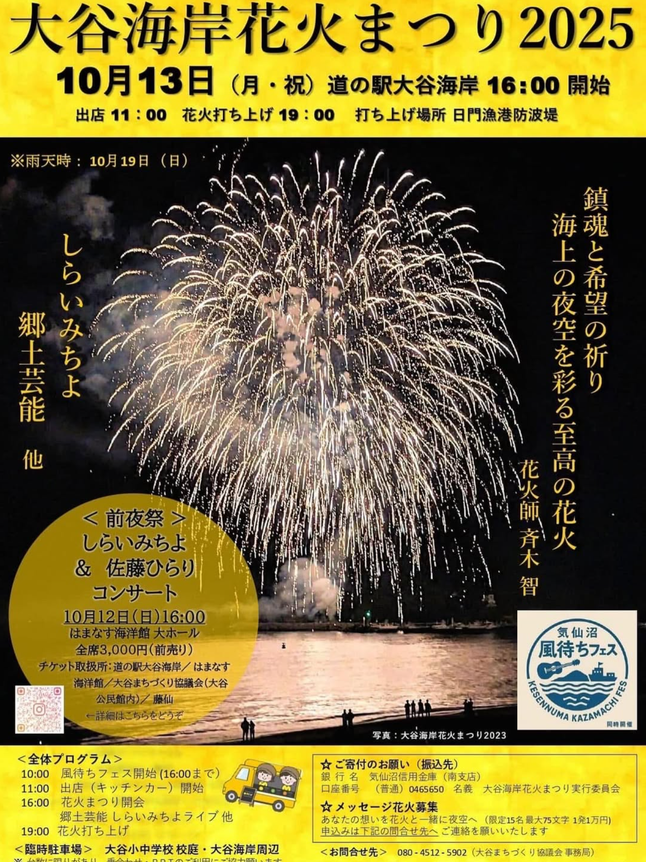 開催日時 | 2025年10月13日(月・祝) 花火打上 19:00~ イベント 16:00~19:30 気仙沼風待ちフェス 10:00~16:00 |