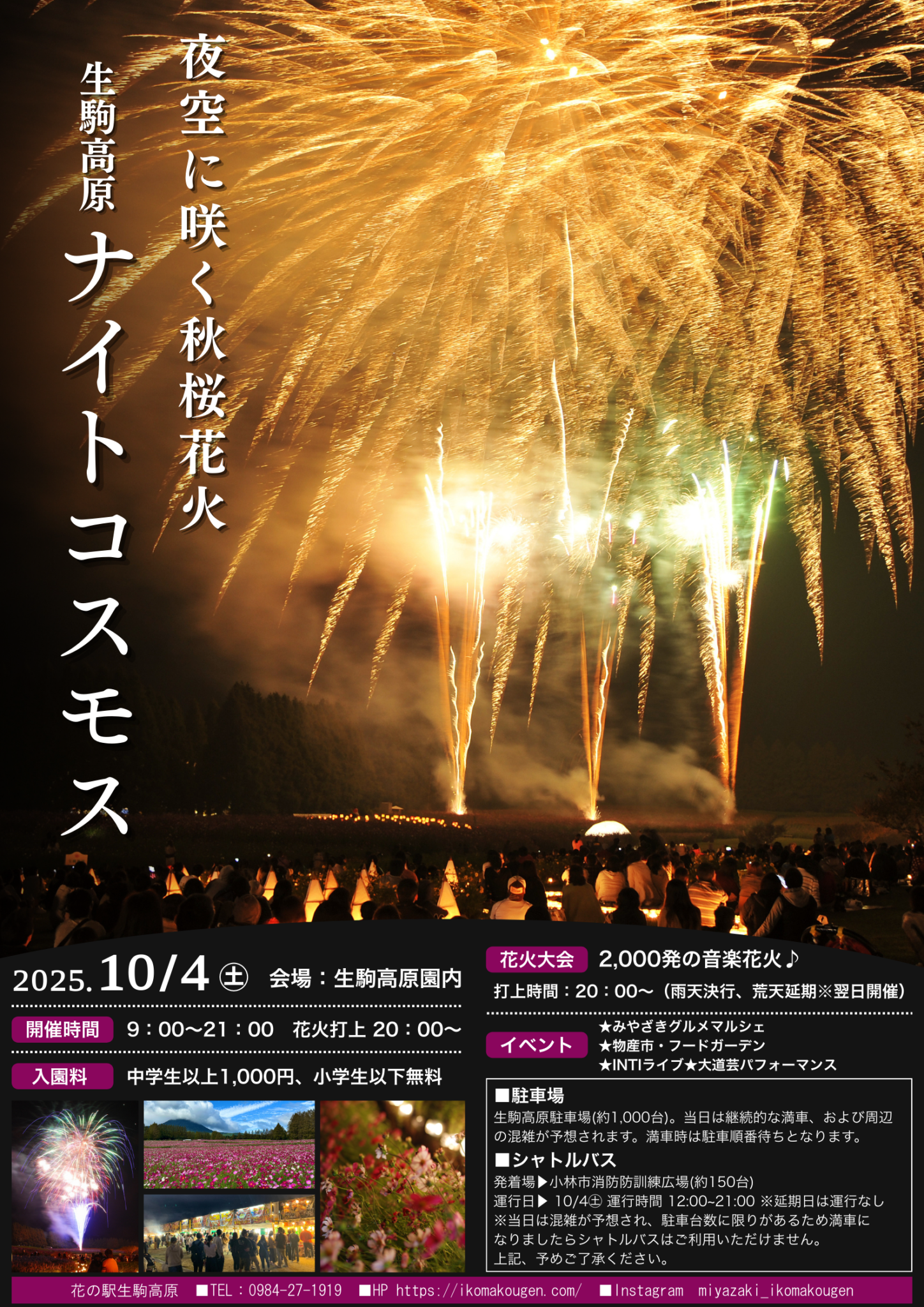 生駒高原コスモスまつりナイトコスモス花火大会は、宮崎県小林市の生駒高原園内で2025年10月4日(土)に行われる花火大会。生駒高原コスモスまつりナイトコスモス花火大会の開催日時、観覧場所、花火打ち上げ数、座席案内、プログラム、交通アクセス、関連動画、写真などの詳細情報。