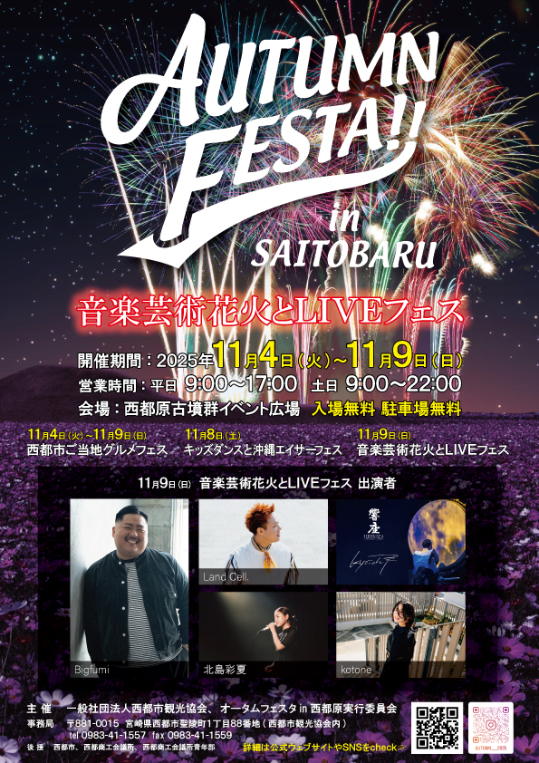 | 問い合わせ | TEL:0983-41-1557 (西都市観光協会内 オータムフェスタin西都原実行委員会) |