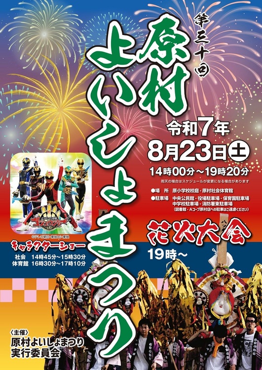 原村よいしょまつり花火大会は、長野県原村の原村立原小学校校庭及び原村社会体育館で2025年8月23日(土)に行われる花火大会。原村よいしょまつり花火大会の開催日時、観覧場所、花火打ち上げ数、座席案内、プログラム、交通アクセス、関連動画、写真などの詳細情報。