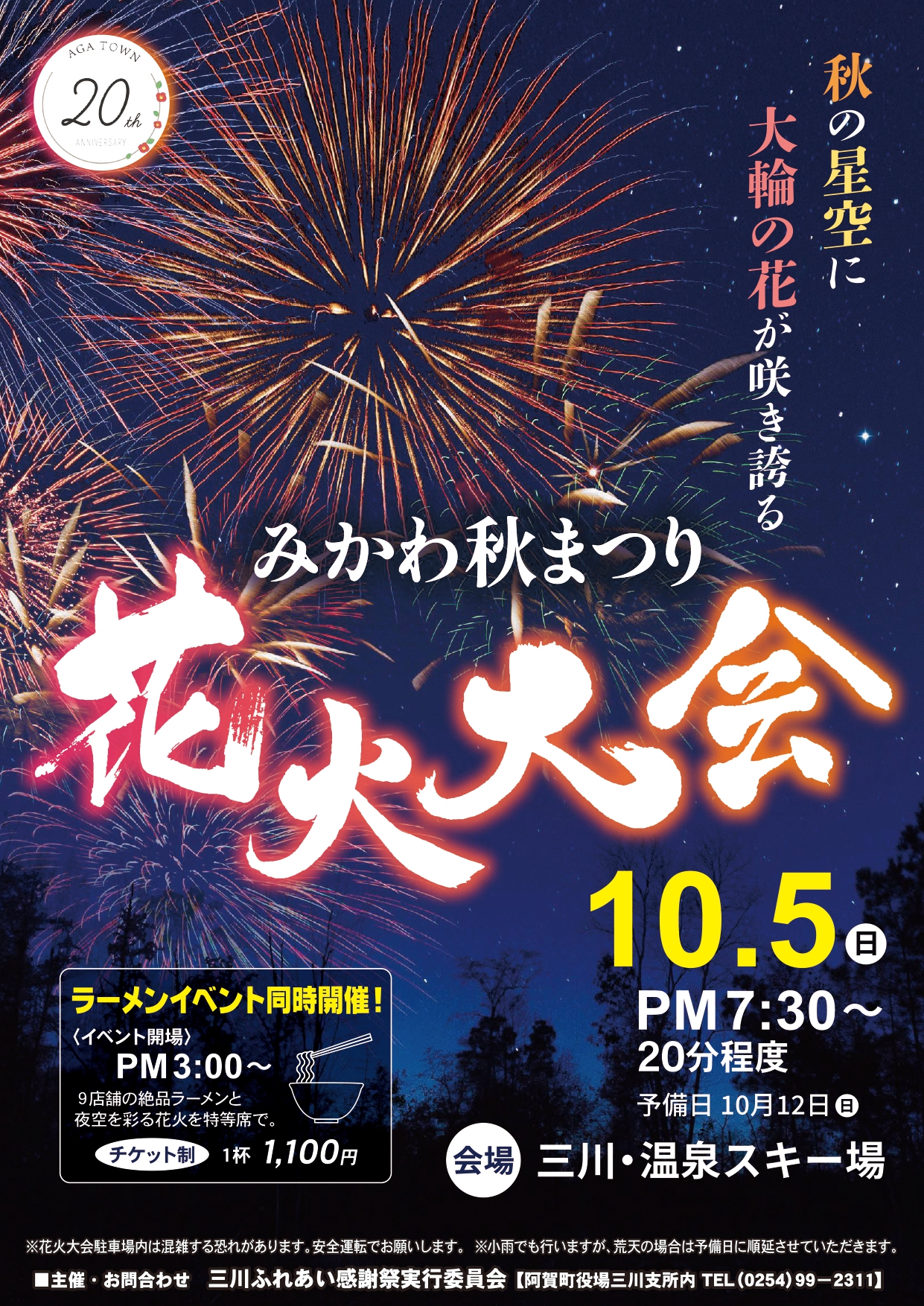 みかわ秋まつり花火大会は、新潟県阿賀町の三川温泉スキー場で2025年10月5日(日)に行われる花火大会。みかわ秋まつり花火大会の開催日時、観覧場所、花火打ち上げ数、座席案内、プログラム、交通アクセス、関連動画、写真などの詳細情報。