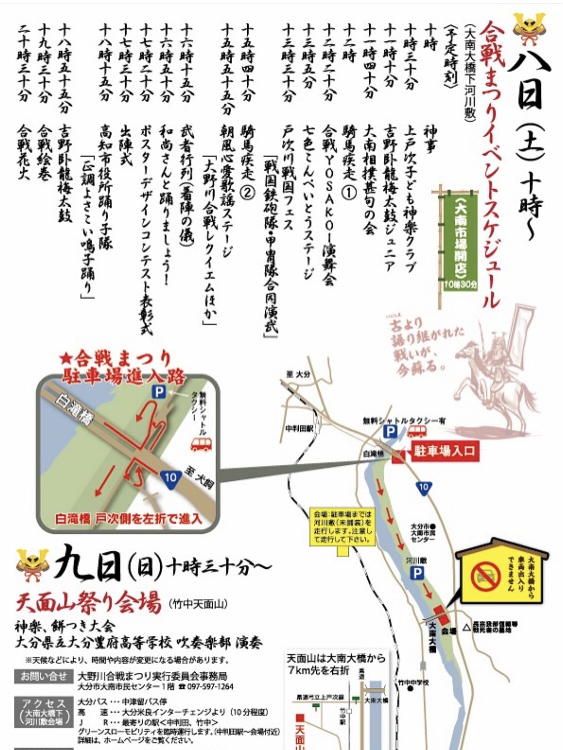 | 問い合わせ | TEL:097-597-1264 (大野川合戦まつり実行委員会事務局) |