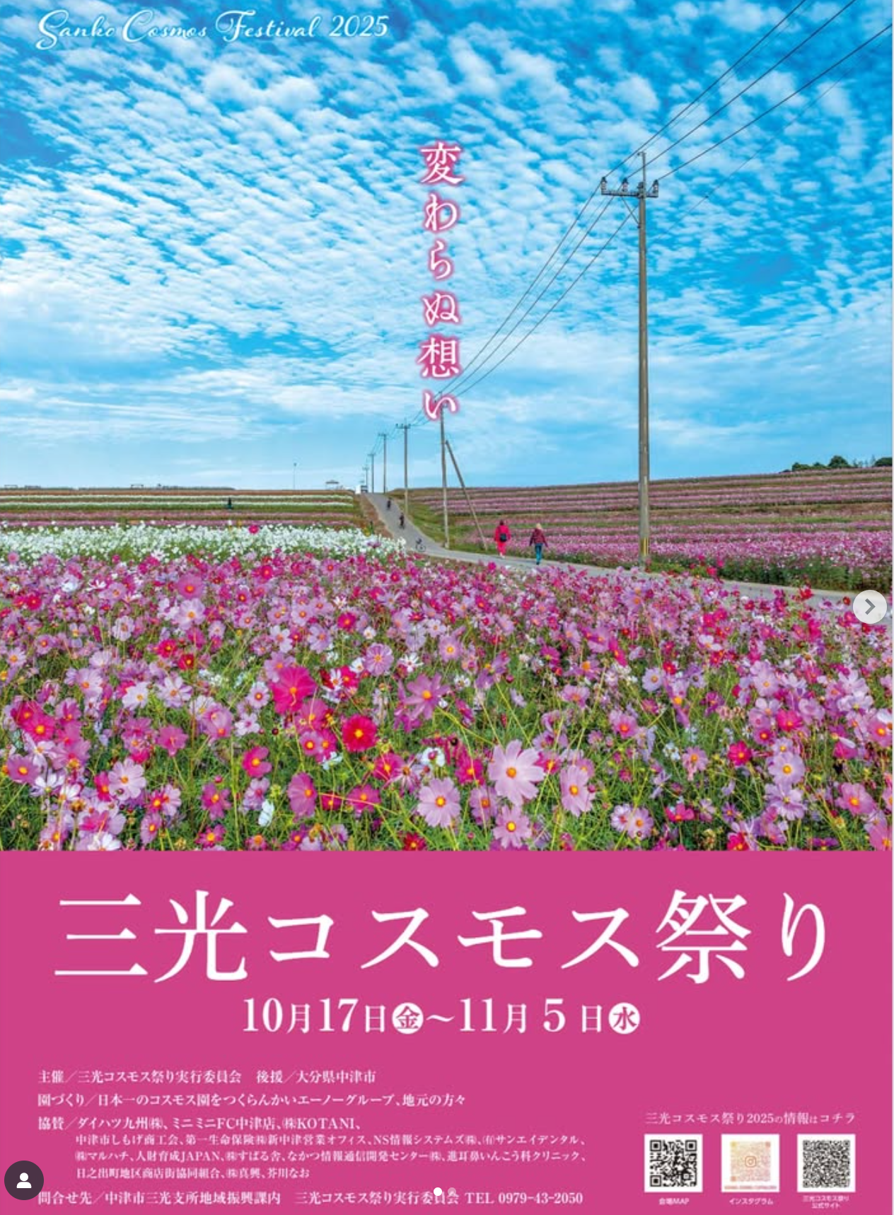 開催日時 | 2025年10月25日(土) 花火打上 :00~:00 イベント :00~ ※※三光コスモス祭りは2025年10月17日(金)~11月5日(水)開催。 |