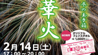 岡山県新見市 哲多冬華火冬の玉手箱(岡山県新見市) 哲多冬華火冬の玉手箱は、岡山県新見市の哲多総合運動公園で2026年2月14日(土)に行われる花火打ち上げ。哲多冬華火冬の玉手箱の開催日時、観覧場所、花火打ち上げ数、座席案内、プログラム、交通アクセス、関連動画、写真などの詳細情報。 岡山県新見市