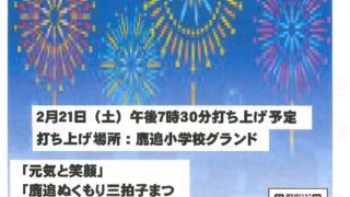北海道鹿追町 冬花火inしかおい(北海道鹿追町) 冬花火inしかおいは、北海道鹿追町の鹿追町立鹿追小学校グラウンドで2026年2月21日(土)に行われる花火打ち上げ。冬花火inしかおいの開催日時、観覧場所、花火打ち上げ数、座席案内、プログラム、交通アクセス、関連動画、写真などの詳細情報。 北海道鹿追町