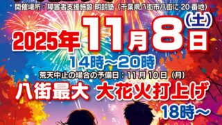 めいろう大花火まつり(めいろう夏まつり大花火打ち上げ)は、千葉県八街市の光明会明朗塾で2025年8月1日(金) → 11月8日(土)に行われる花火打ち上げ。めいろう夏まつり大花火打ち上げの開催日時、観覧場所、花火打ち上げ数、座席案内、プログラム、交通アクセス、関連動画、写真などの詳細情報。