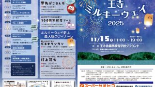 奈良県王寺町 王寺ミルキーウェイ花火打ち上げ(奈良県王寺町) 王寺ミルキーウェイ花火打ち上げは、奈良県王寺町の王寺北義務教育学校グラウンドで2025年11月15日(土)に行われる花火打ち上げ。王寺ミルキーウェイ花火打ち上げの開催日時、観覧場所、花火打ち上げ数、座席案内、プログラム、交通アクセス、関連動画、写真などの詳細情報。 奈良県王寺町